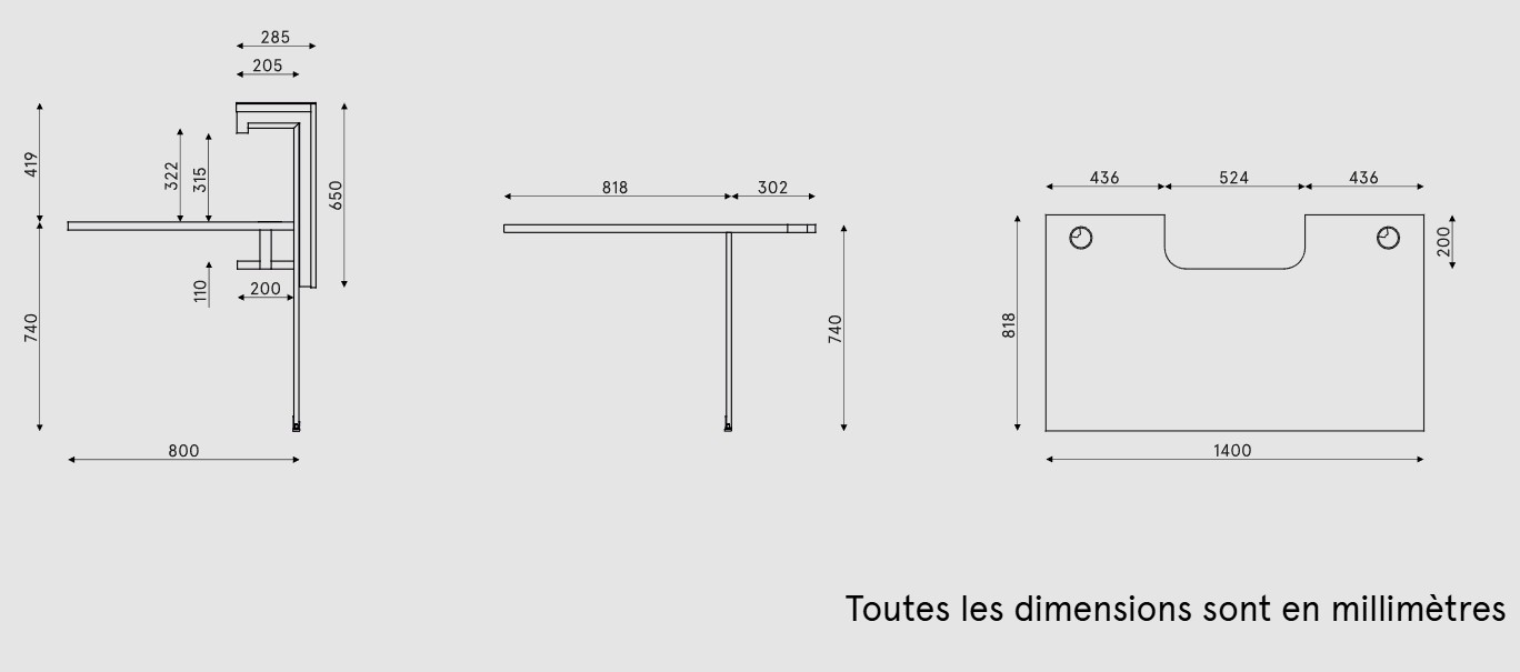 .Top et Plan de travail en particules de mélamine ep.28mm chants ABS assortis au plateau