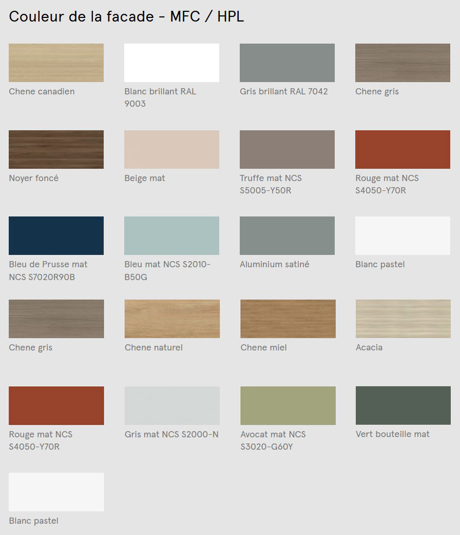 .Façade : Mélaminé ep. 28mm finitions disponibles : Avocat mat, Beige mat, Blanc brillant, Bleu de prusse mat, Bleu mat, Gris brillant, Gris mat, Rouge mat, Truffe mat et Vert bouteille mat